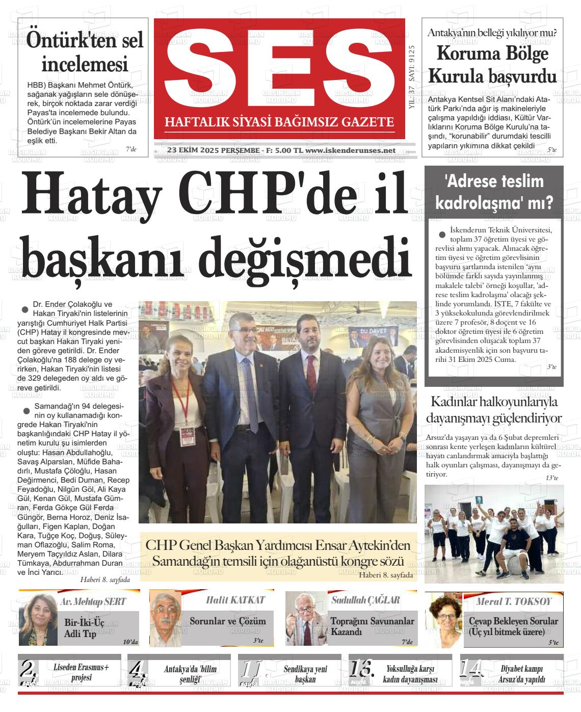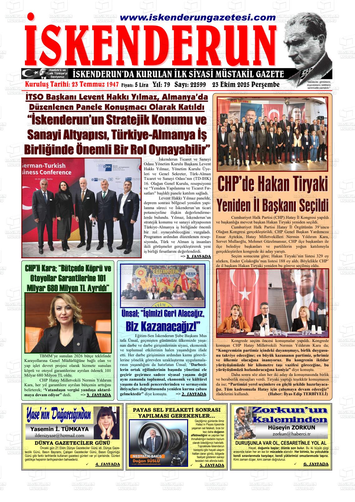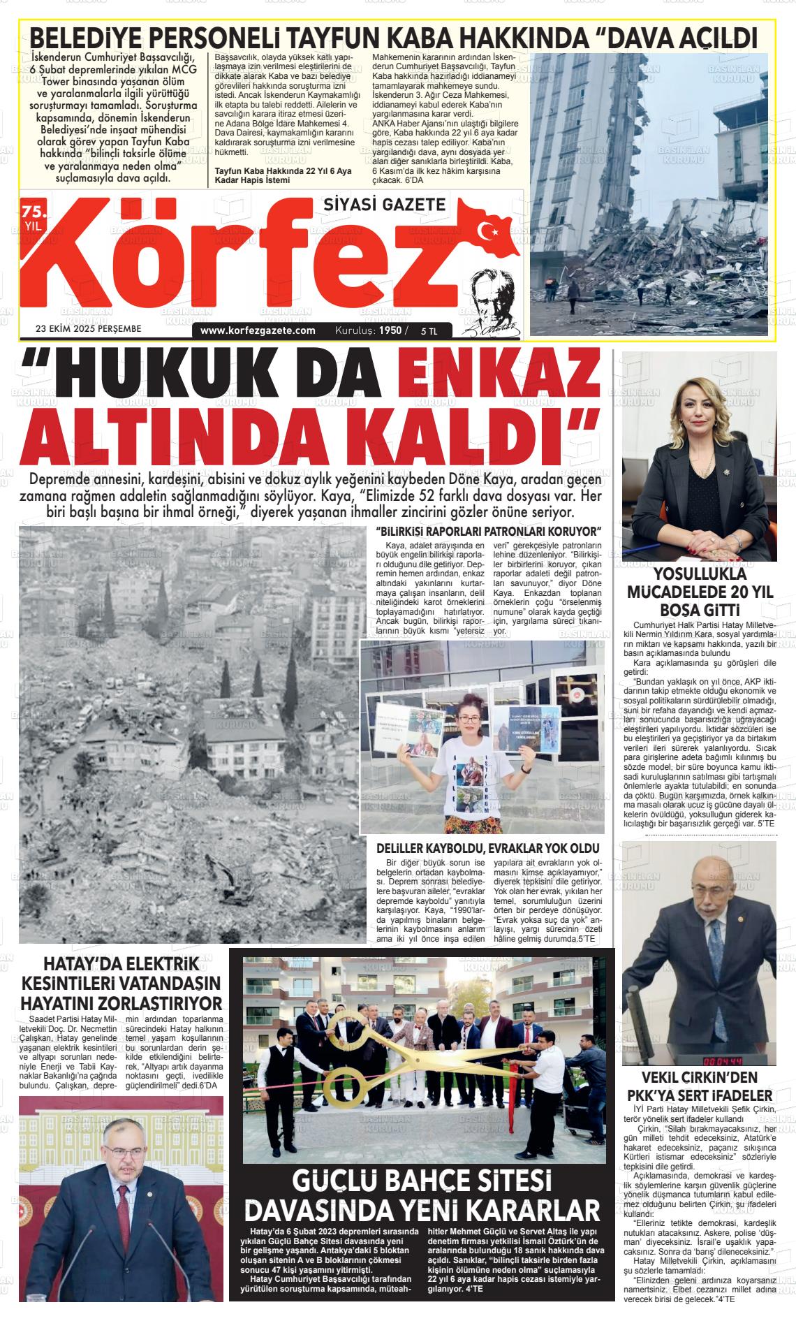Hatay Yerel Gazeteleri 23 Ekim 2025, Perşembe Günü Manşeti