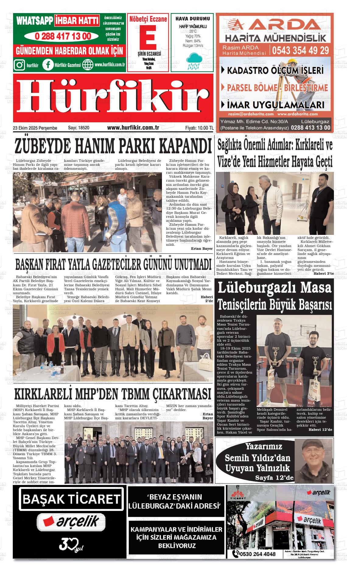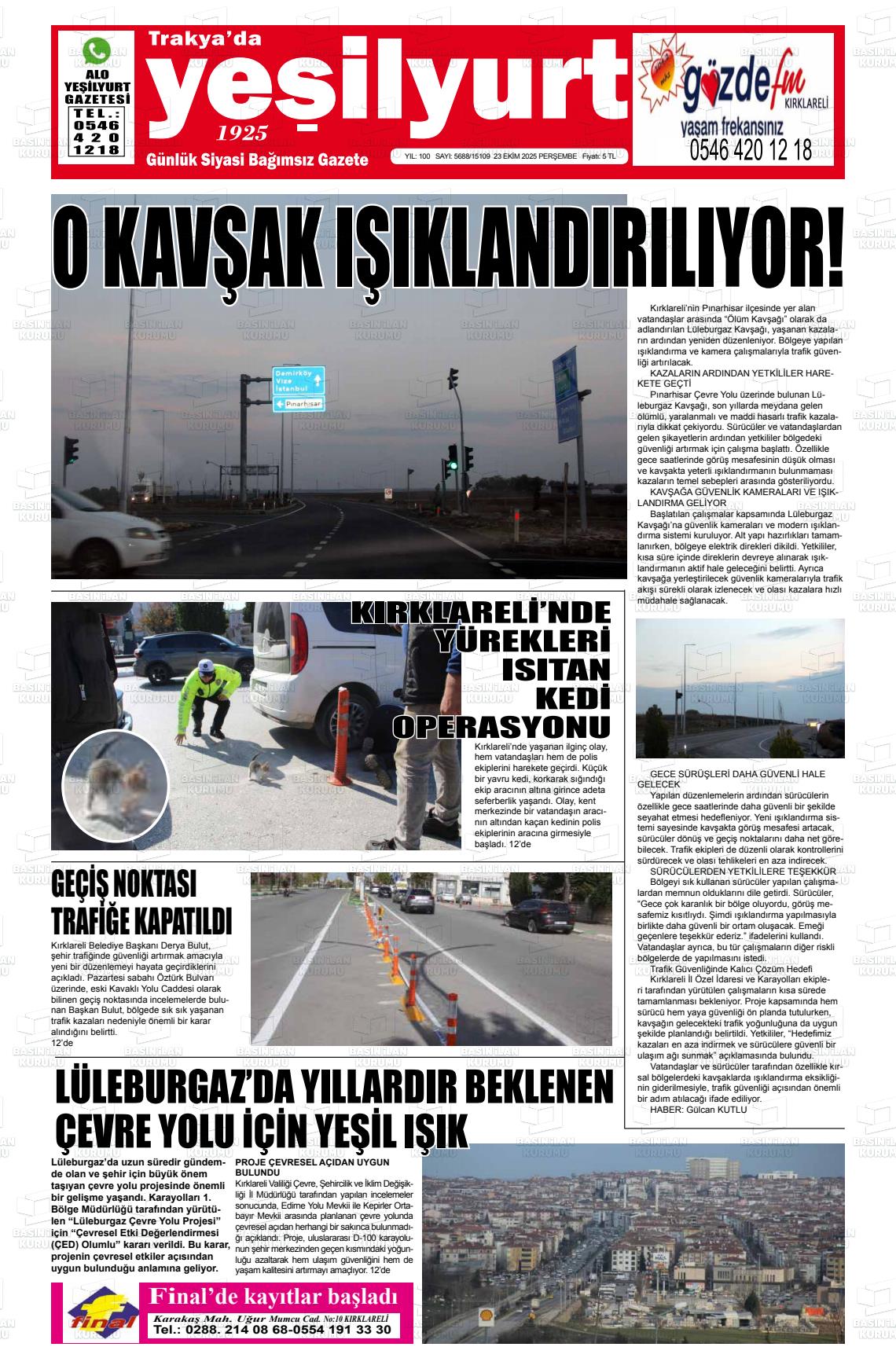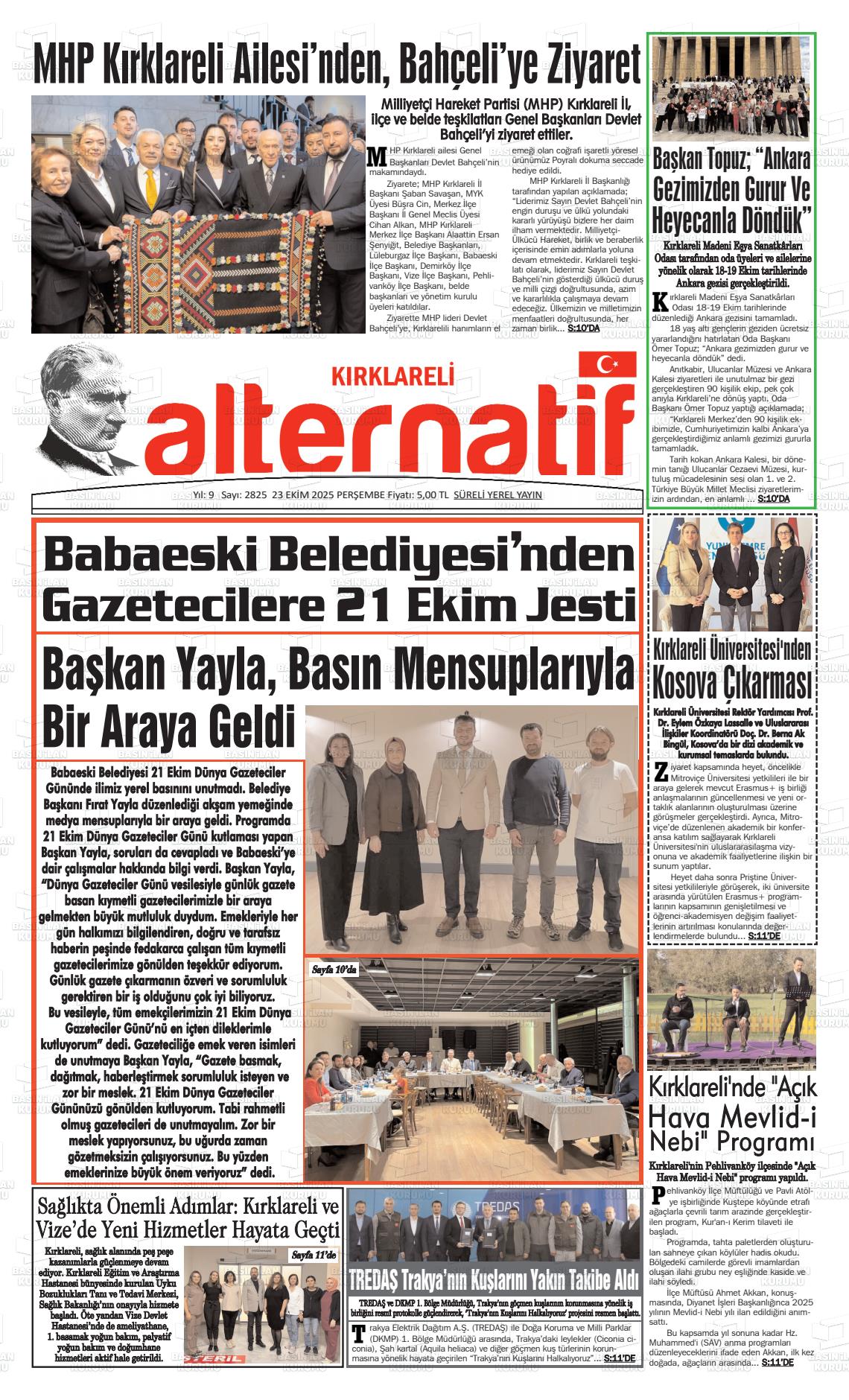 Kırklarelİ Yerel Gazeteleri 23 Ekim 2025, Perşembe Günü Manşeti