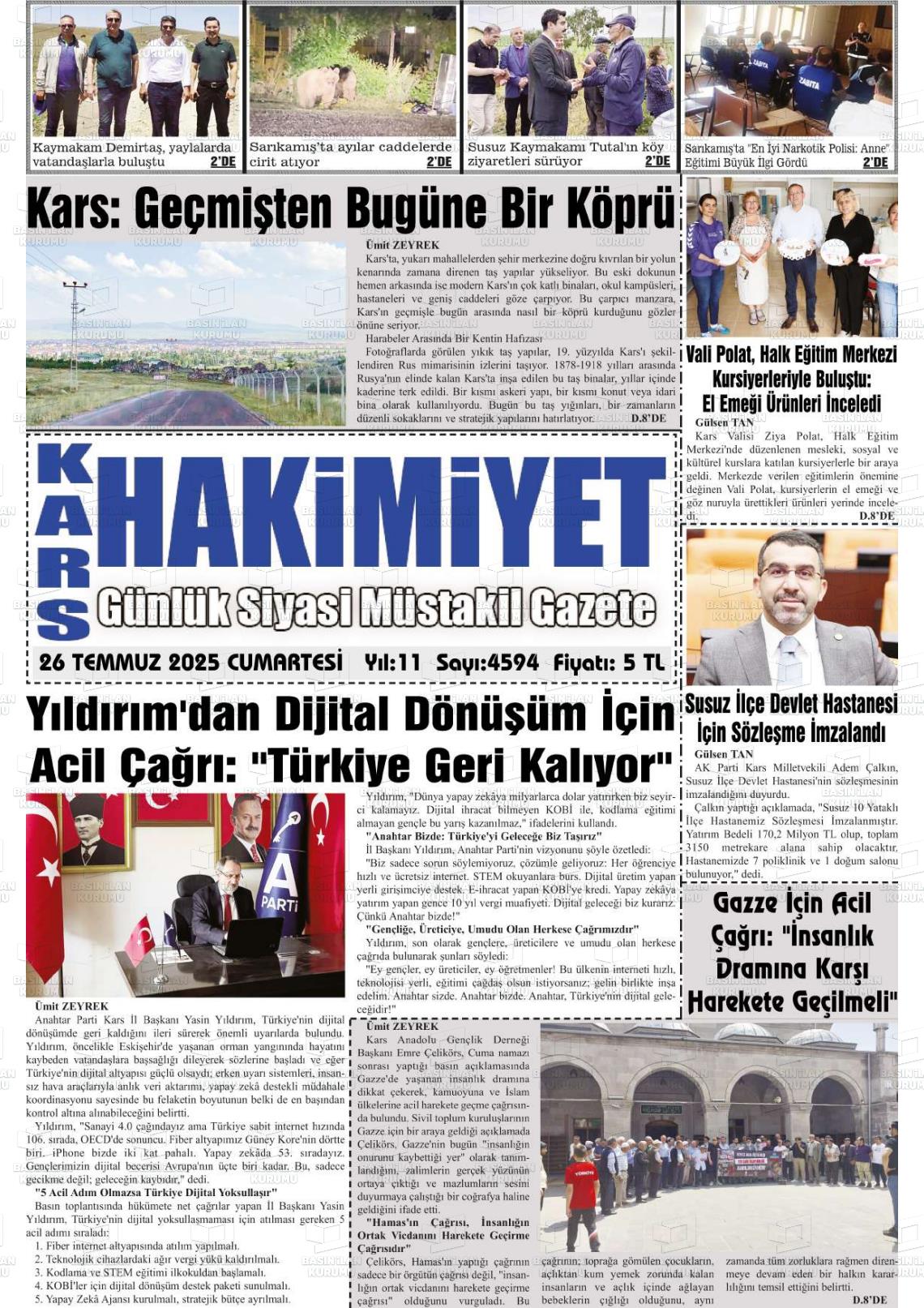 Kars Yerel Gazeteleri 23 Ekim 2025, Perşembe Günü Manşeti