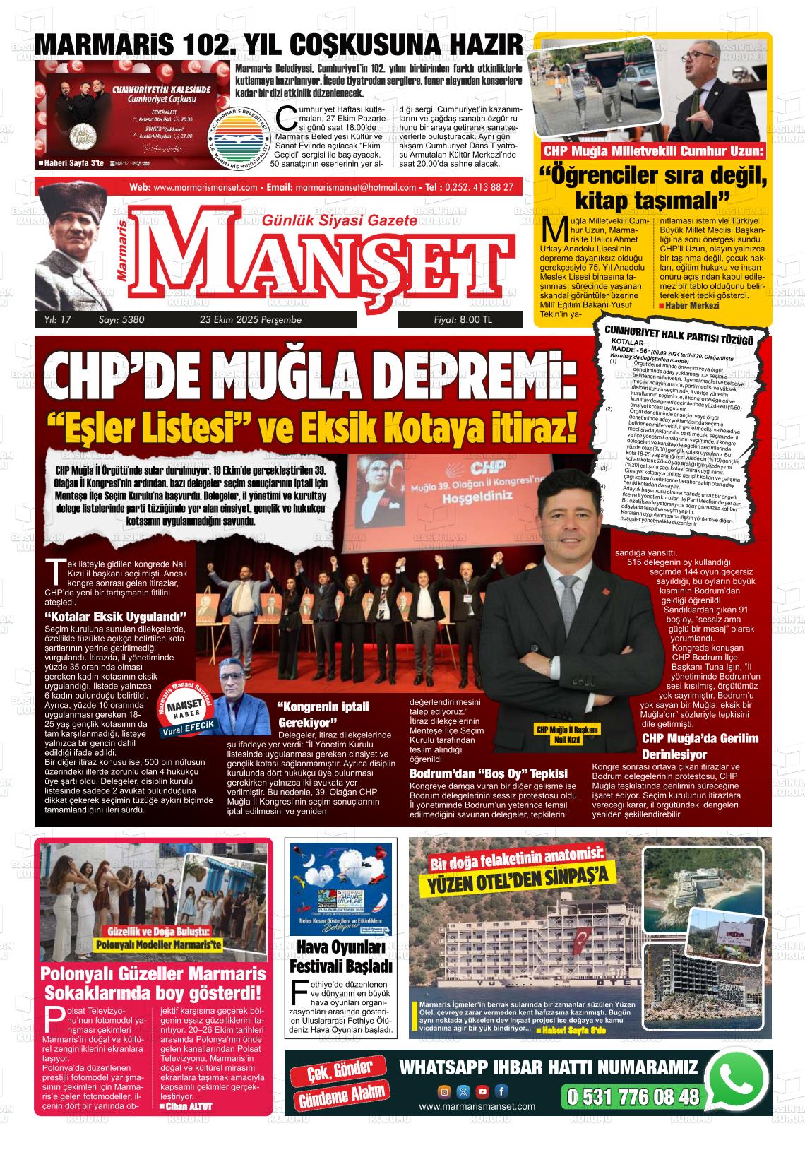 Muğla Yerel Gazeteleri 23 Ekim 2025, Perşembe Günü Manşeti