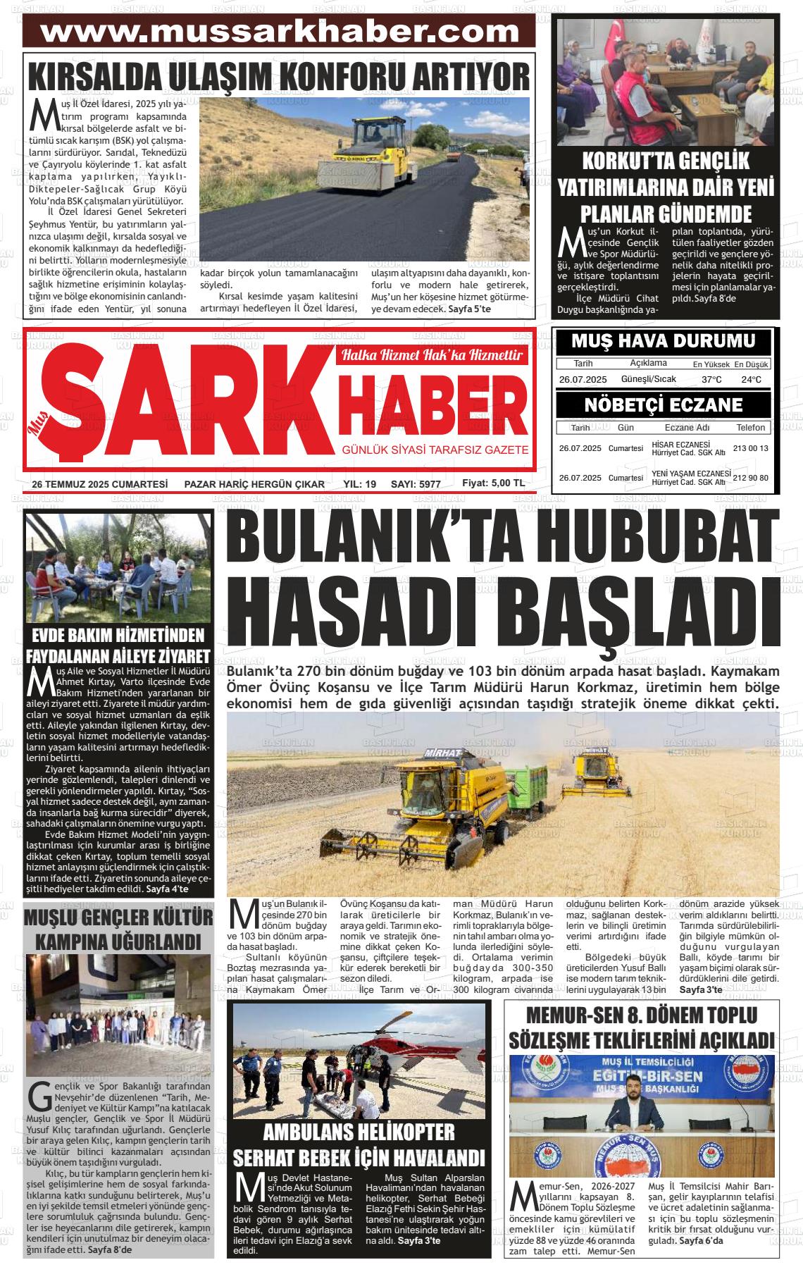 Muş Yerel Gazeteleri 23 Ekim 2025, Perşembe Günü Manşeti
