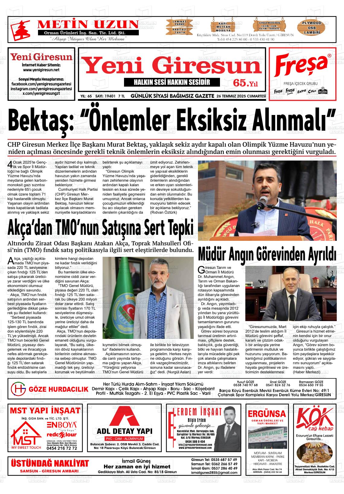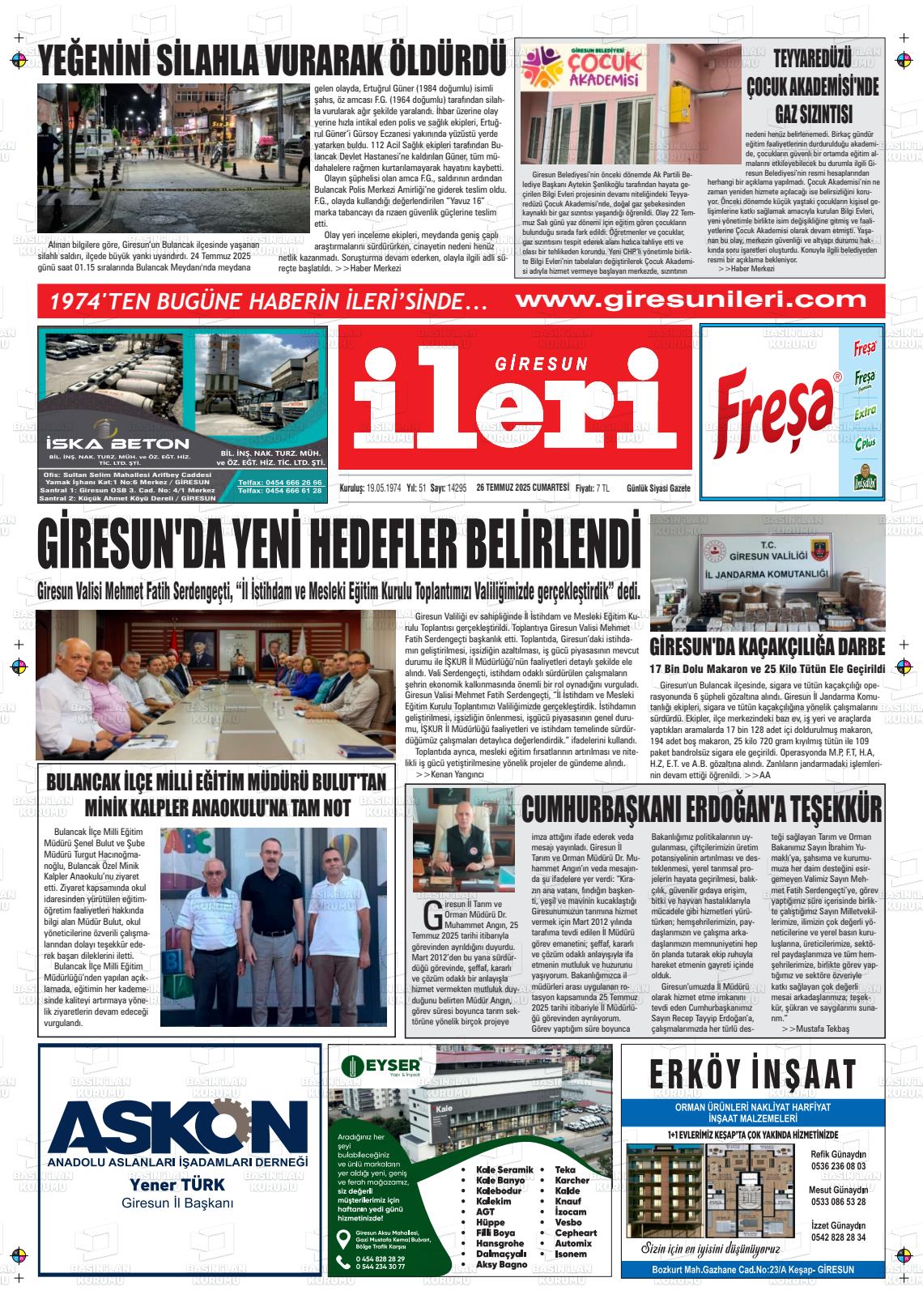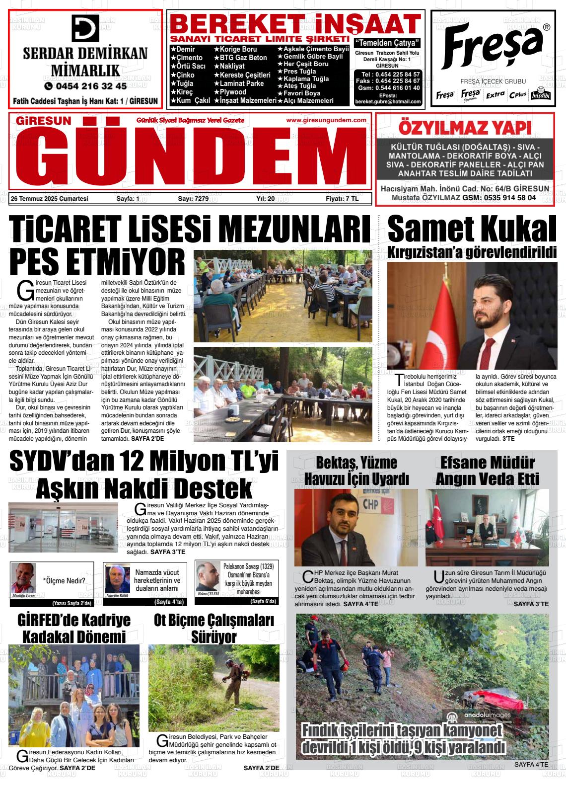 Gİresun Yerel Gazeteleri 08 Aralık 2025, Pazartesi Günü Manşeti
