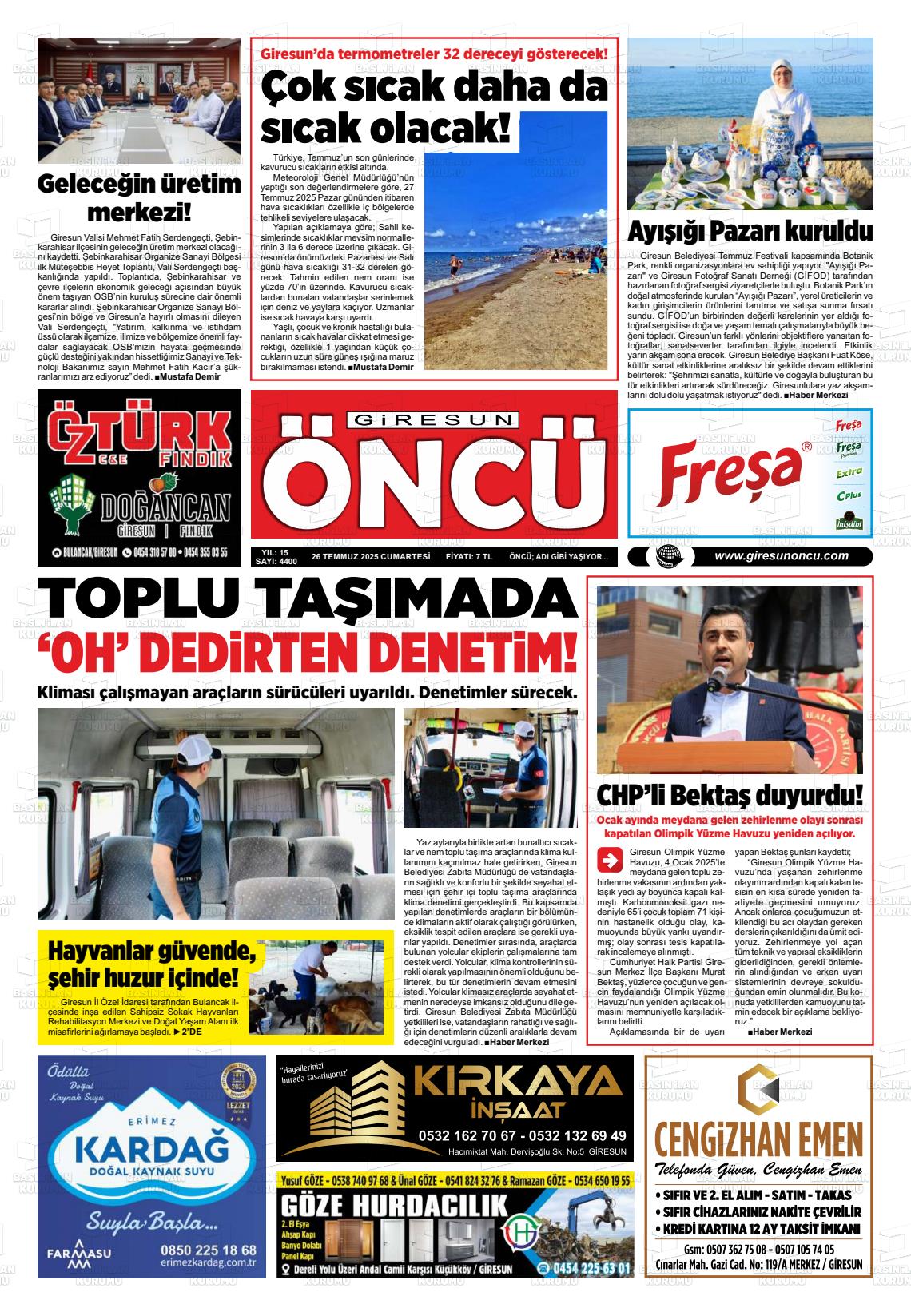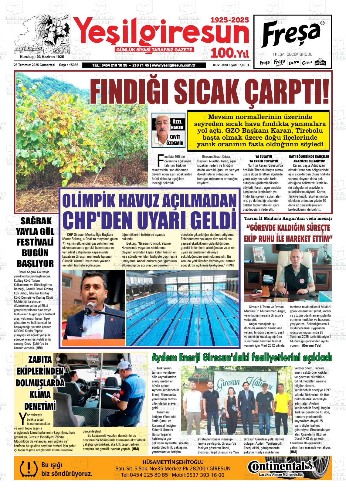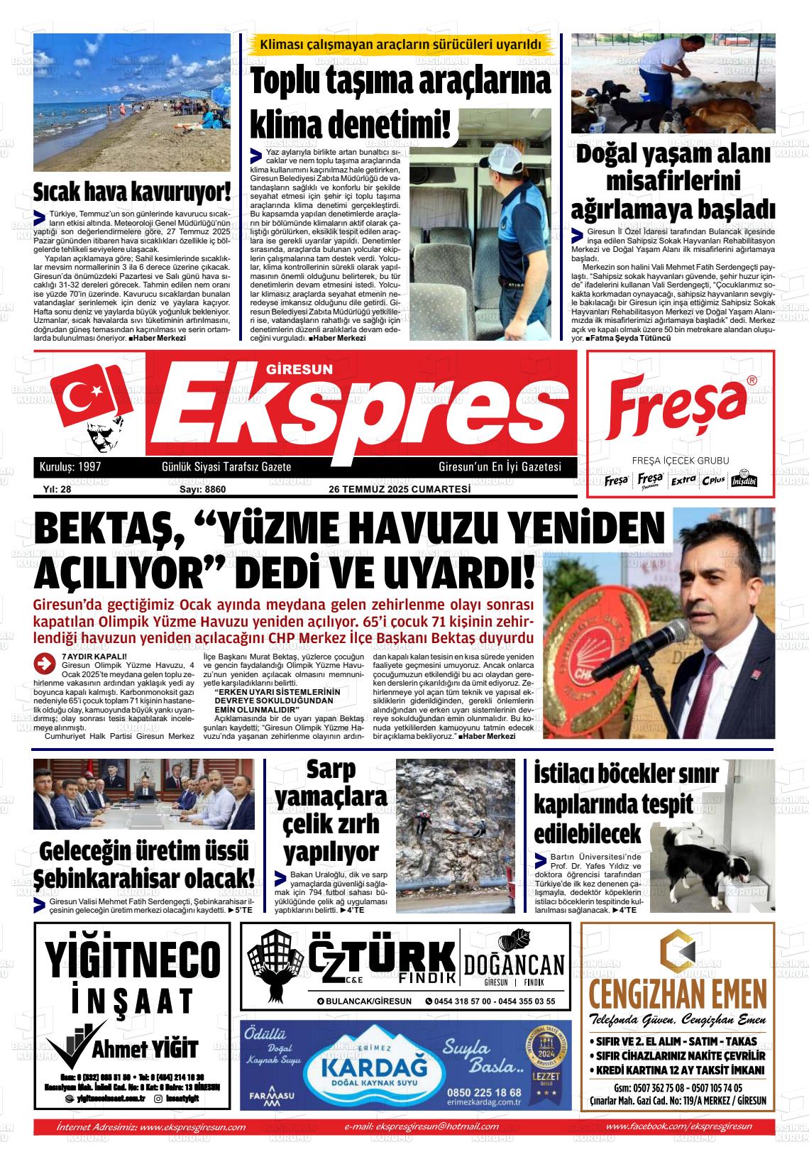 Gİresun Yerel Gazeteleri 08 Aralık 2025, Pazartesi Günü Manşeti