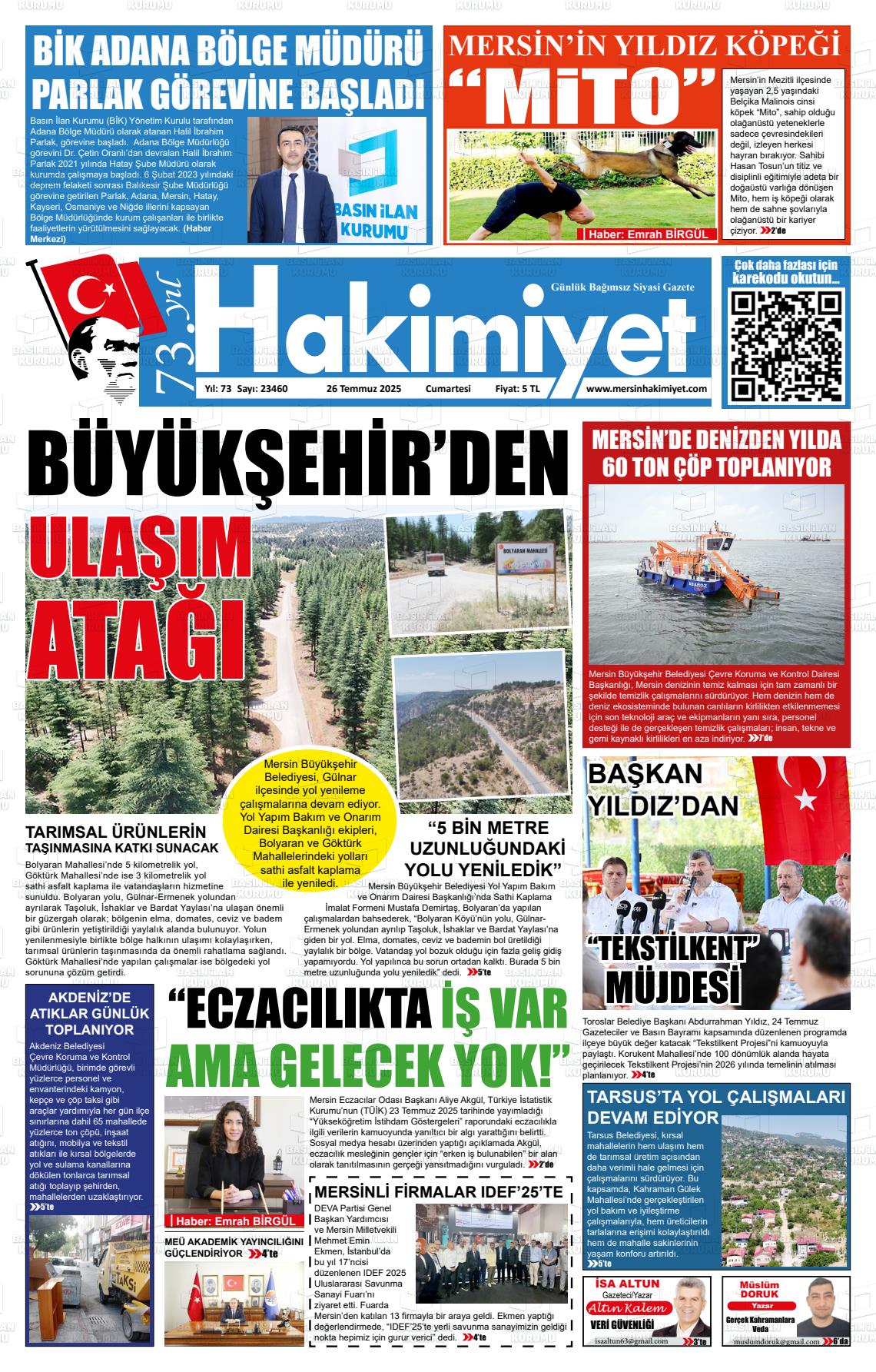 Mersİn Yerel Gazeteleri 18 Aralık 2025, Perşembe Günü Manşeti