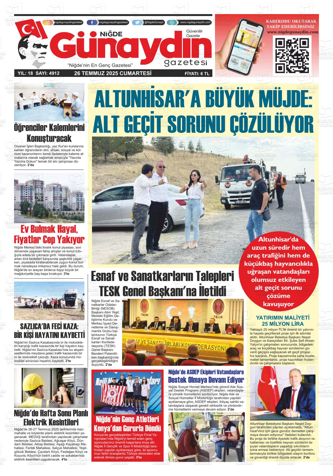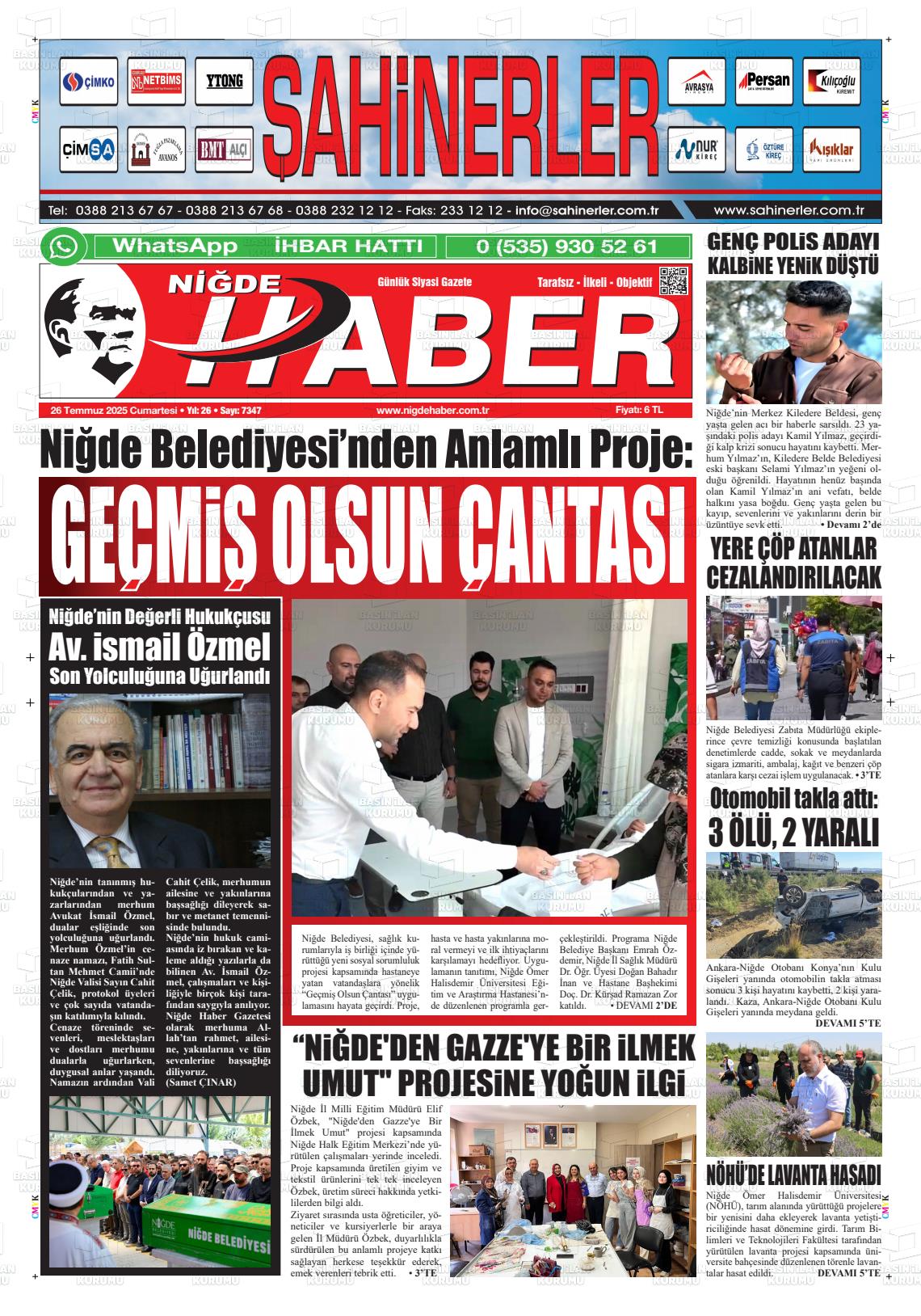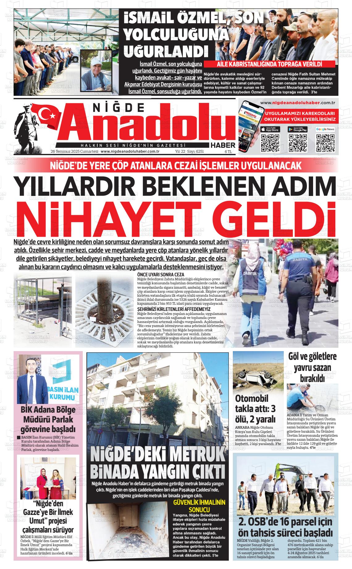 Nİğde Yerel Gazeteleri 08 Aralık 2025, Pazartesi Günü Manşeti