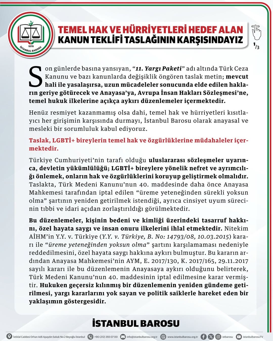 İstanbul Barosu açıklamasında, Anayasa’nın 6. maddesine atıf yaparak, kaynağını Anayasa’dan almayan hiçbir yetkinin meşru olamayacağını vurguladı:
