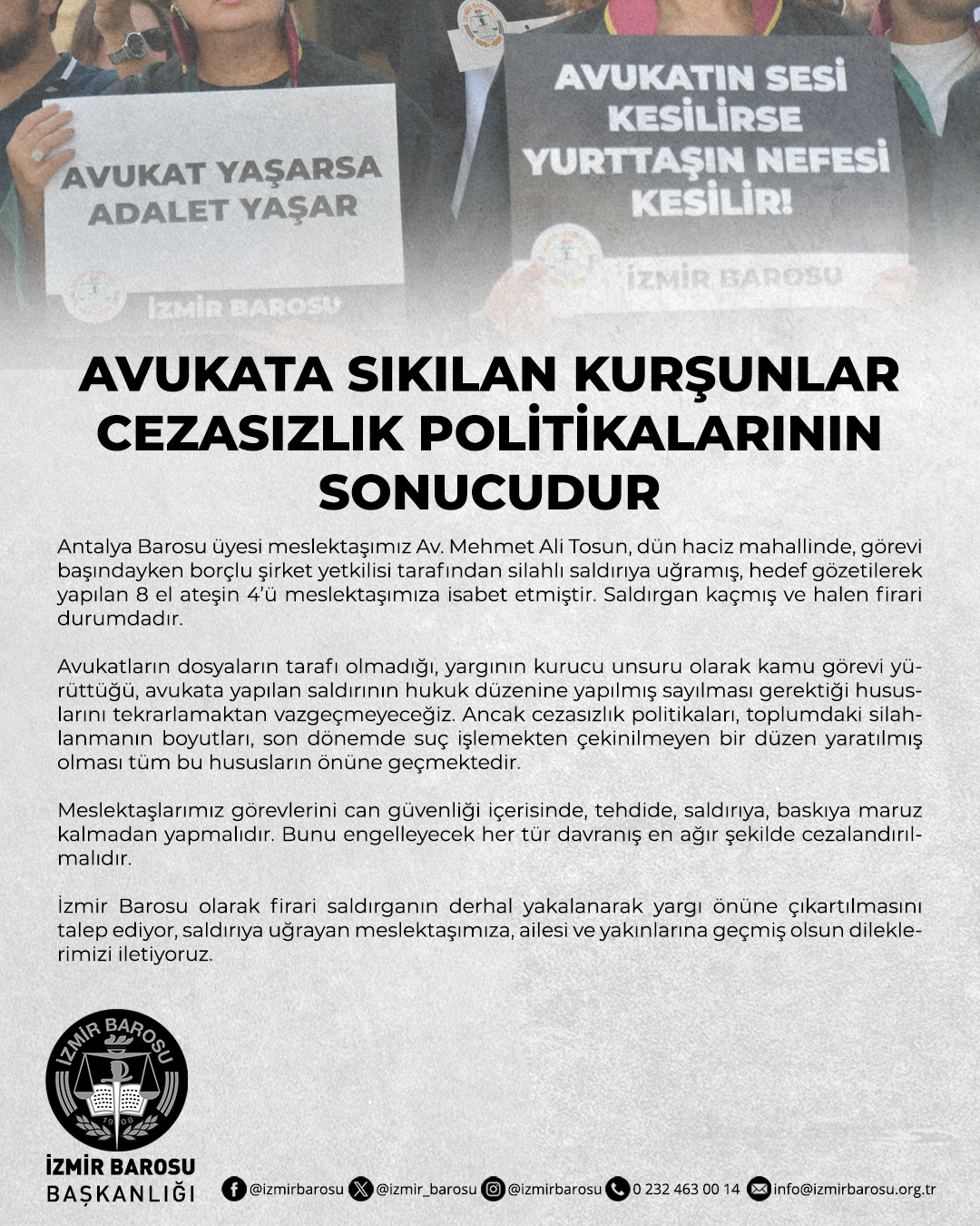 İzmir Barosu, kamu avukatlarının hiçbir durumda yalnız bırakılmayacağını vurguladı. Hak ihlallerine karşı etkin yaptırım mekanizmalarının işletileceği, meslek onurunu zedeleyen uygulamalara karşı ise dayanışmanın güçlendirileceği ifade edildi.